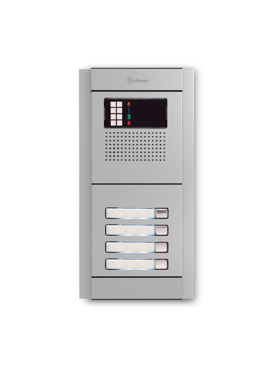 Vier beldrukkers met verwisselbare naamkader. Compleet geassembleerd geleverd. Aluminium front, akoestische feedback (tonen) bij bediening. Optische weergave voor Oproep | Communicatie | Deur openen | Bezet. Gesproken feedback via dip-schakelaar instelbaar.